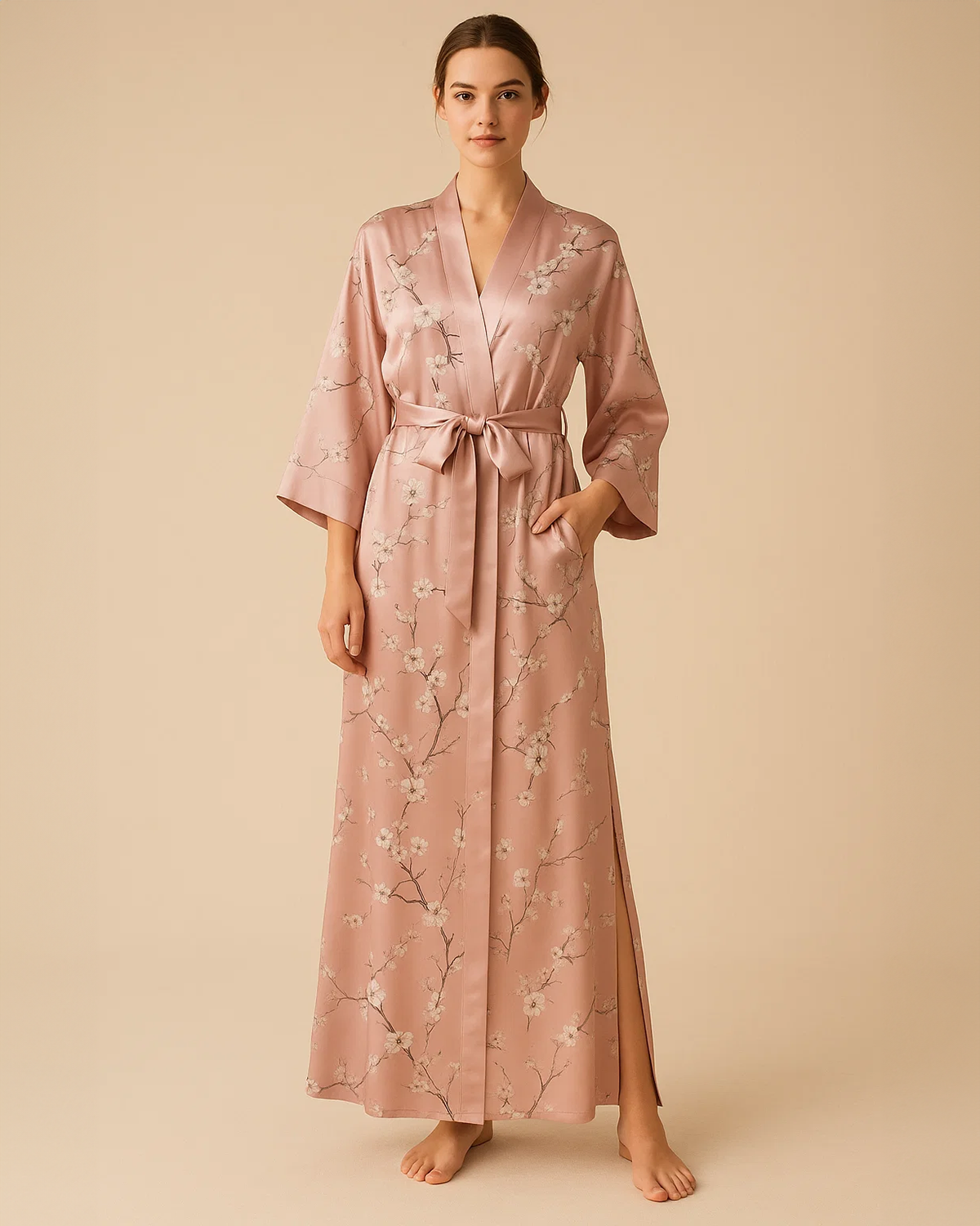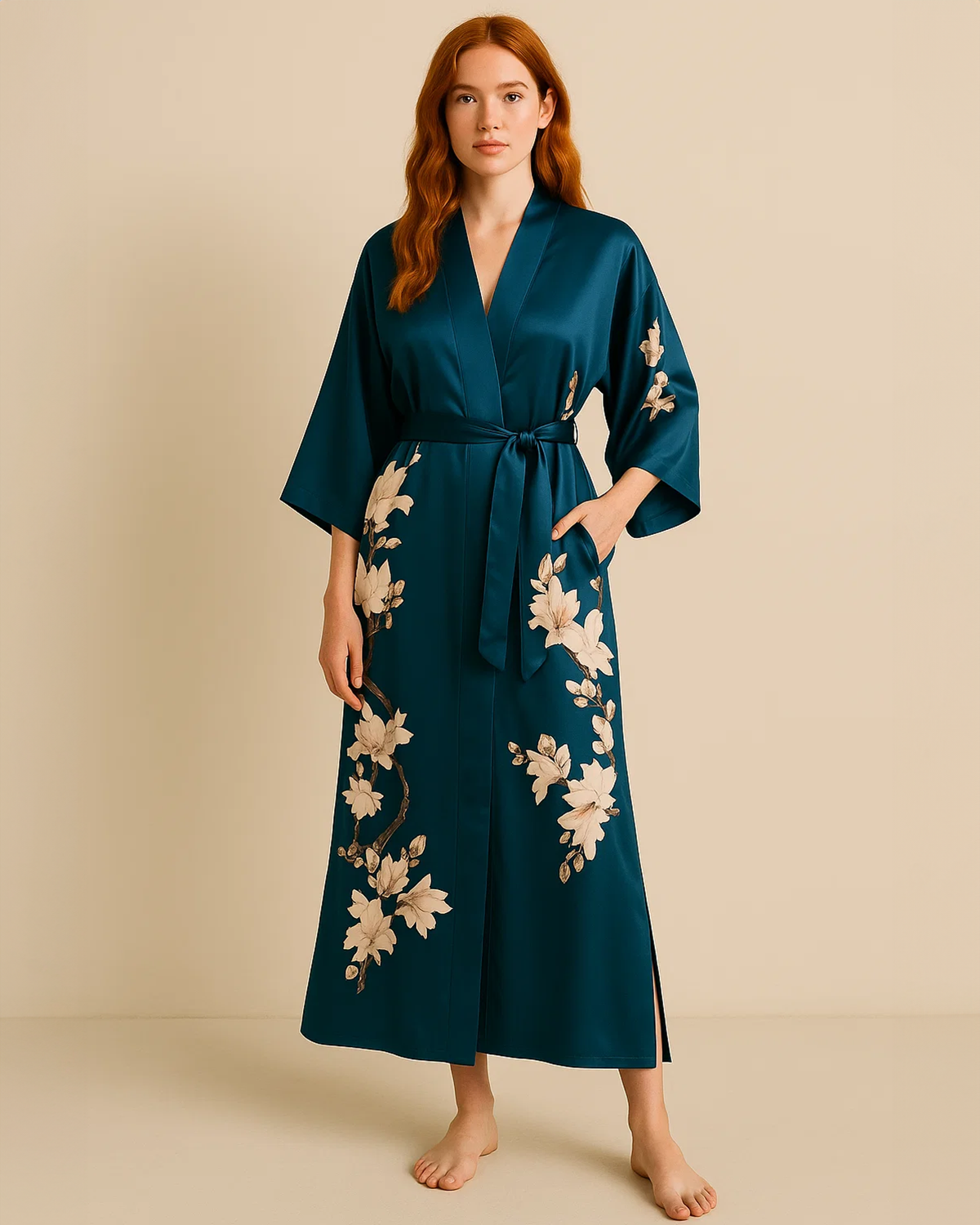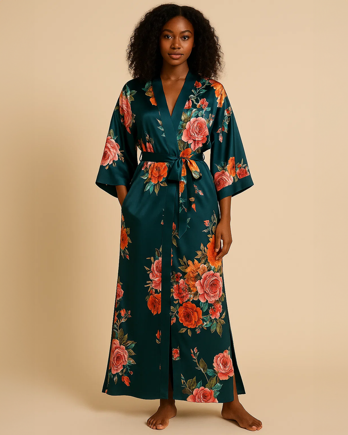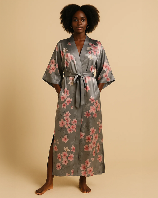 Satin Long Kimono Robe with Floral Print - Japanese Dressing Gown Satin Long Kimono Robe with Floral Print - Japanese Dressing Gown