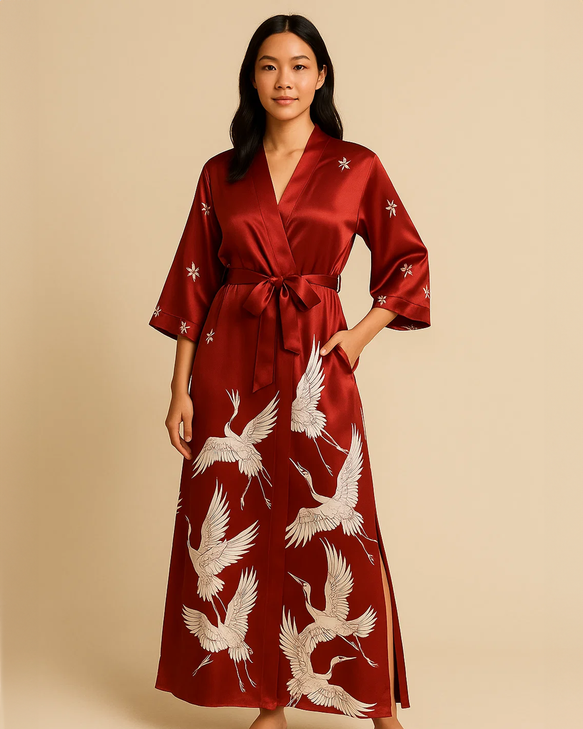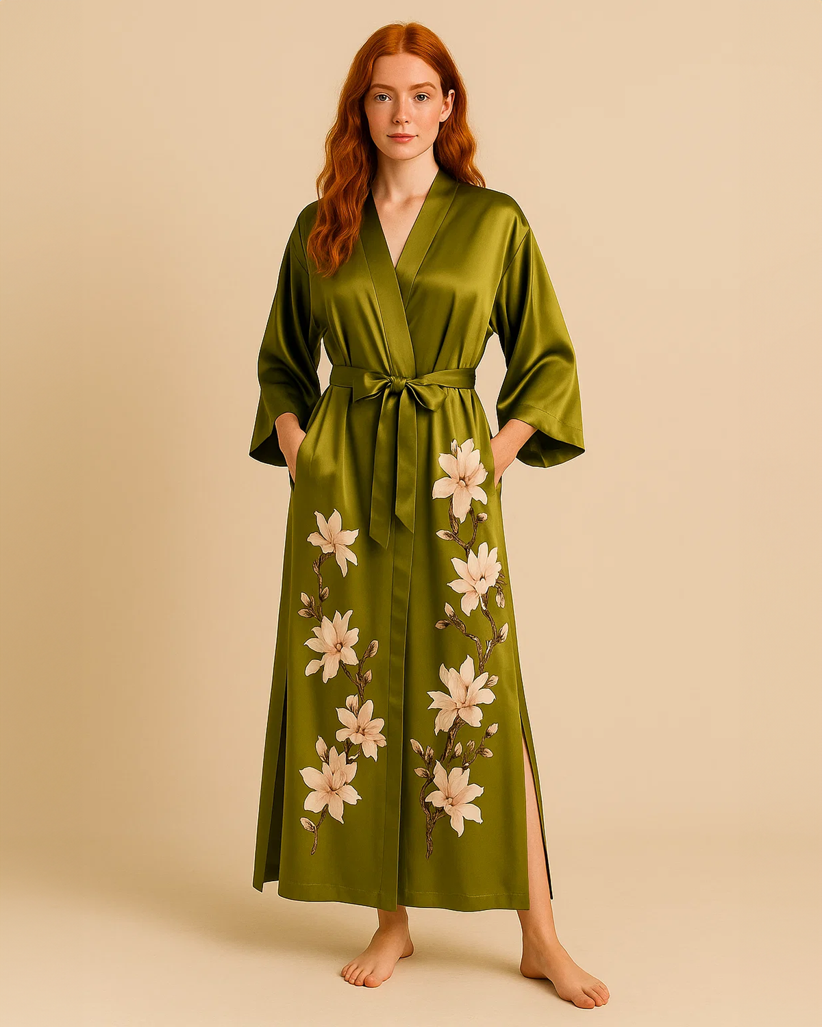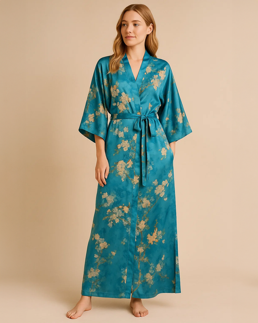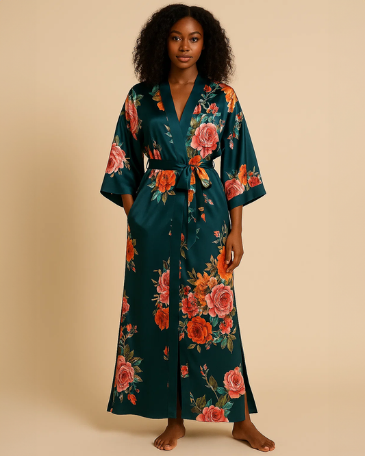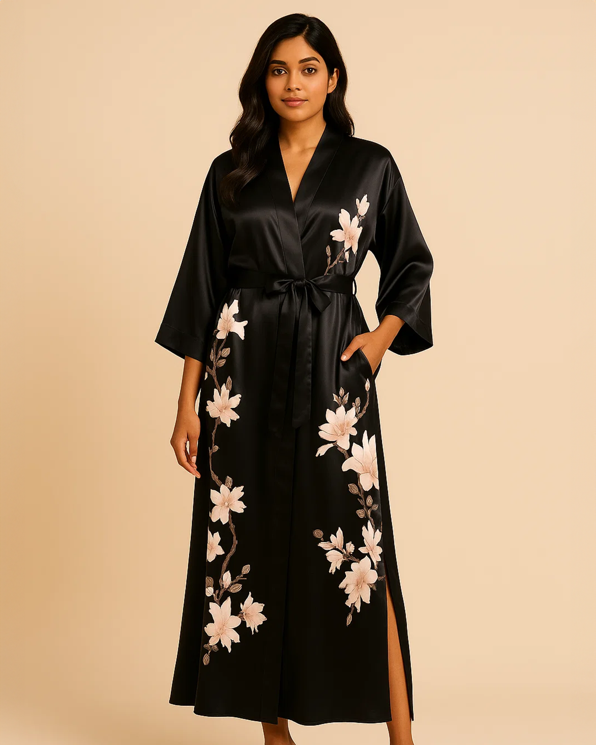 Satin Long Kimono Robe with Floral Print - Japanese Dressing Gown Satin Long Kimono Robe with Floral Print - Japanese Dressing Gown