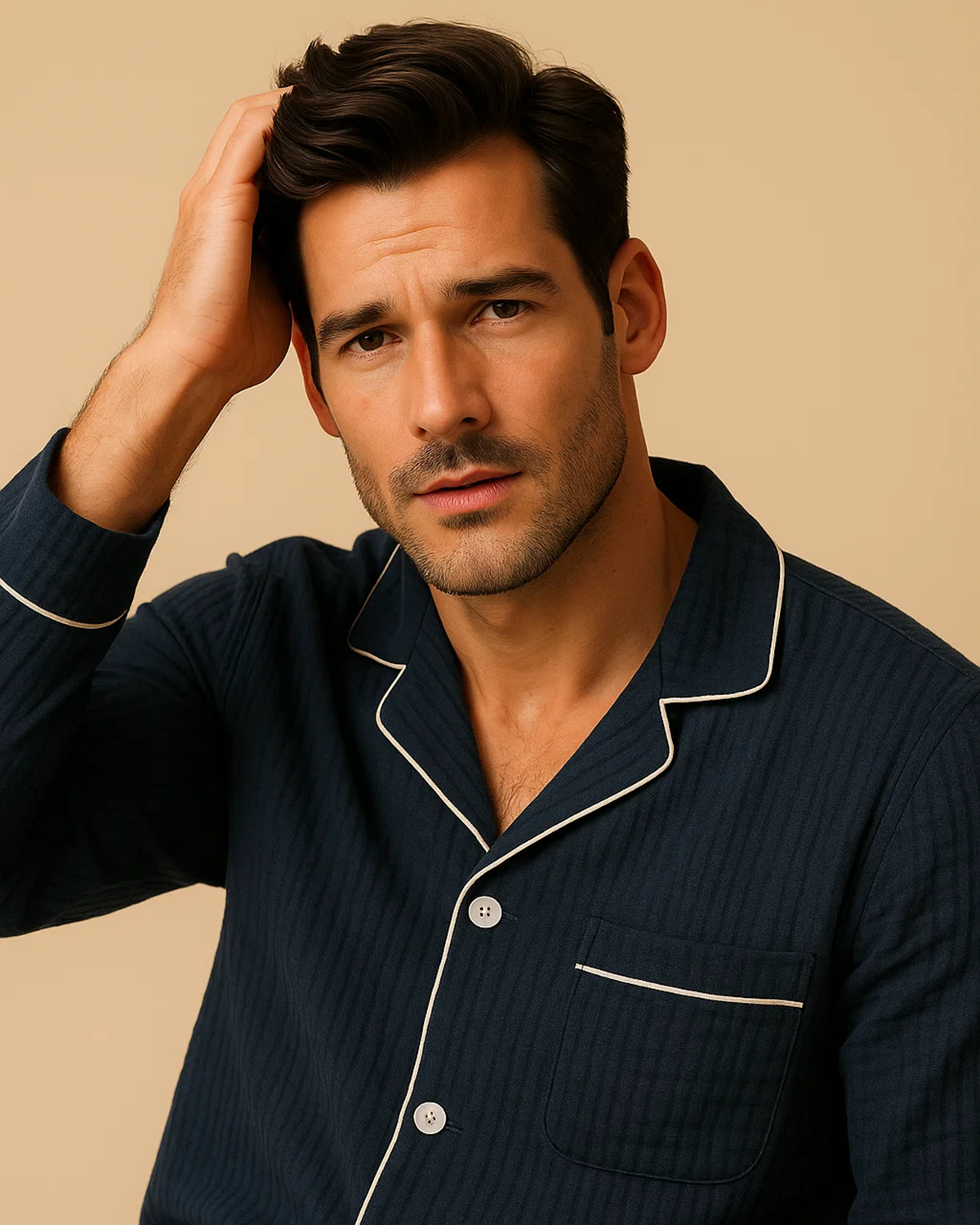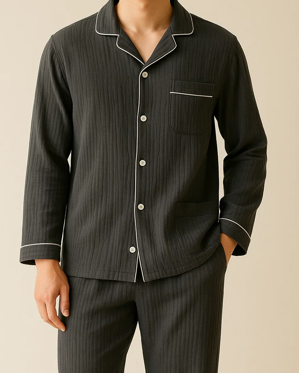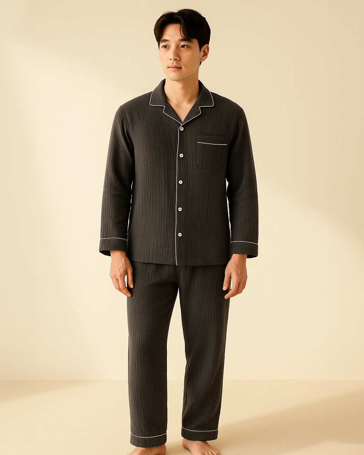 Men’s Cotton Muslin Long Pyjama Set – Lightweight Crepe Button-Up Men’s Cotton Muslin Long Pyjama Set – Lightweight Crepe Button-Up