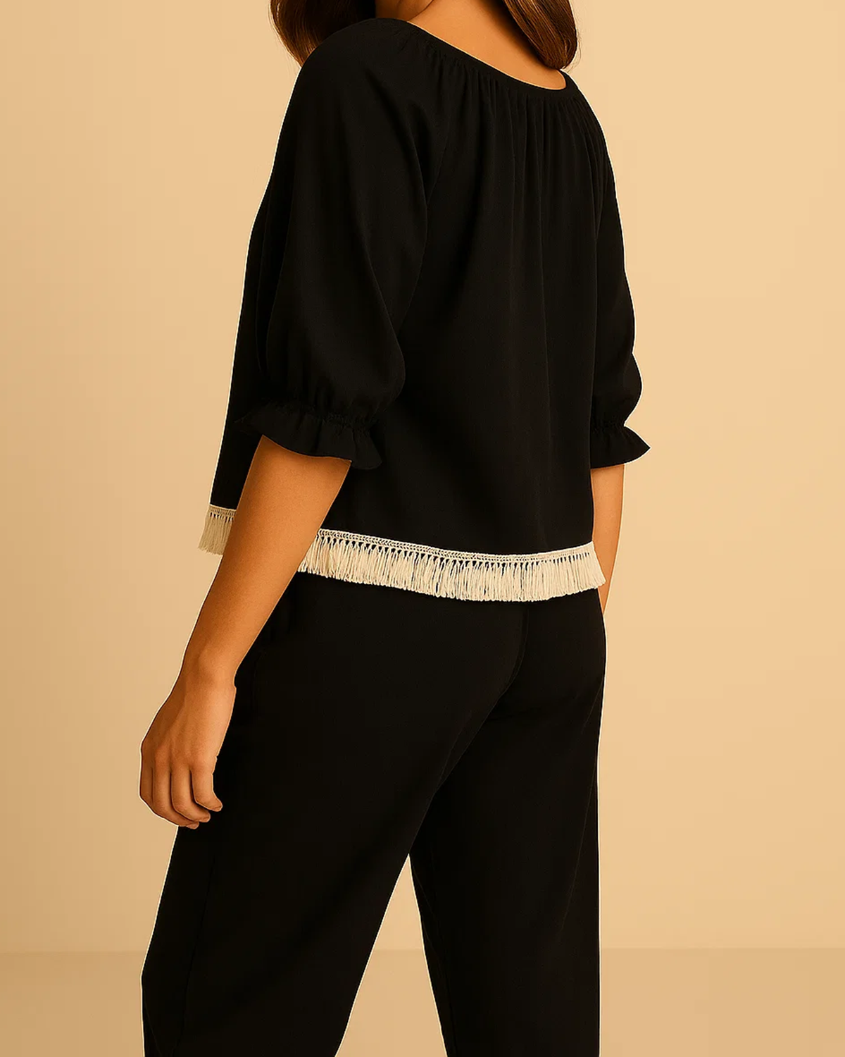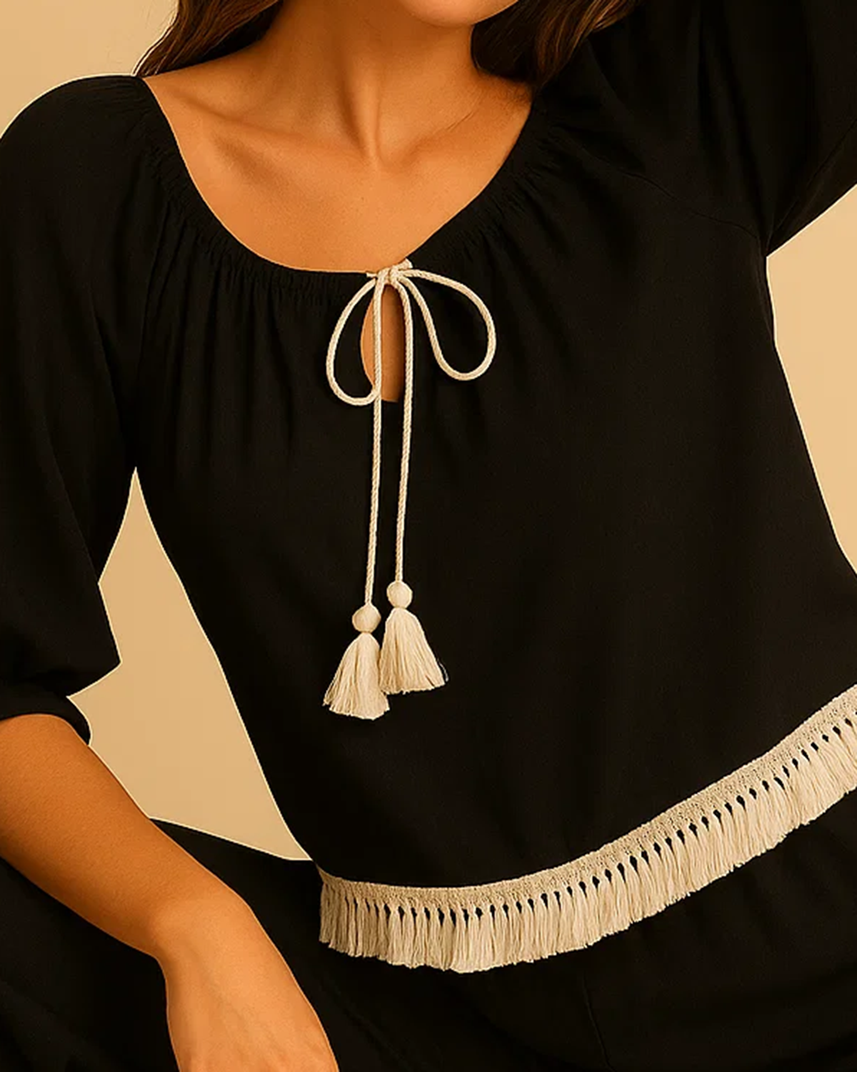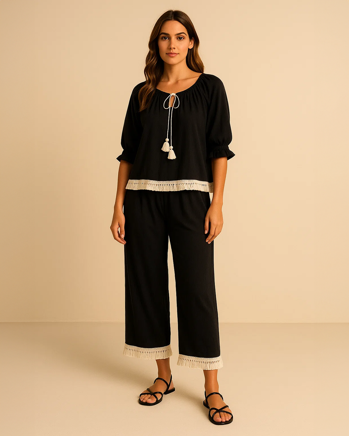 Black Cotton-Bamboo Loungewear Set – Tassel Detail & Fringe Trim Black Cotton-Bamboo Loungewear Set – Tassel Detail & Fringe Trim