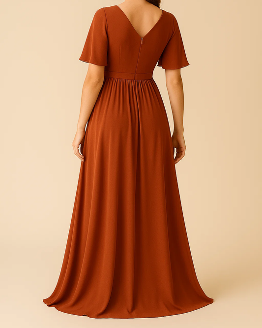 Regular price £135.00 GBP Sale price £114.75 GBPTerra Dress - Burnt Orange Maxi Dress with Flutter Sleeves | Ethical Occasionwear by ADKN