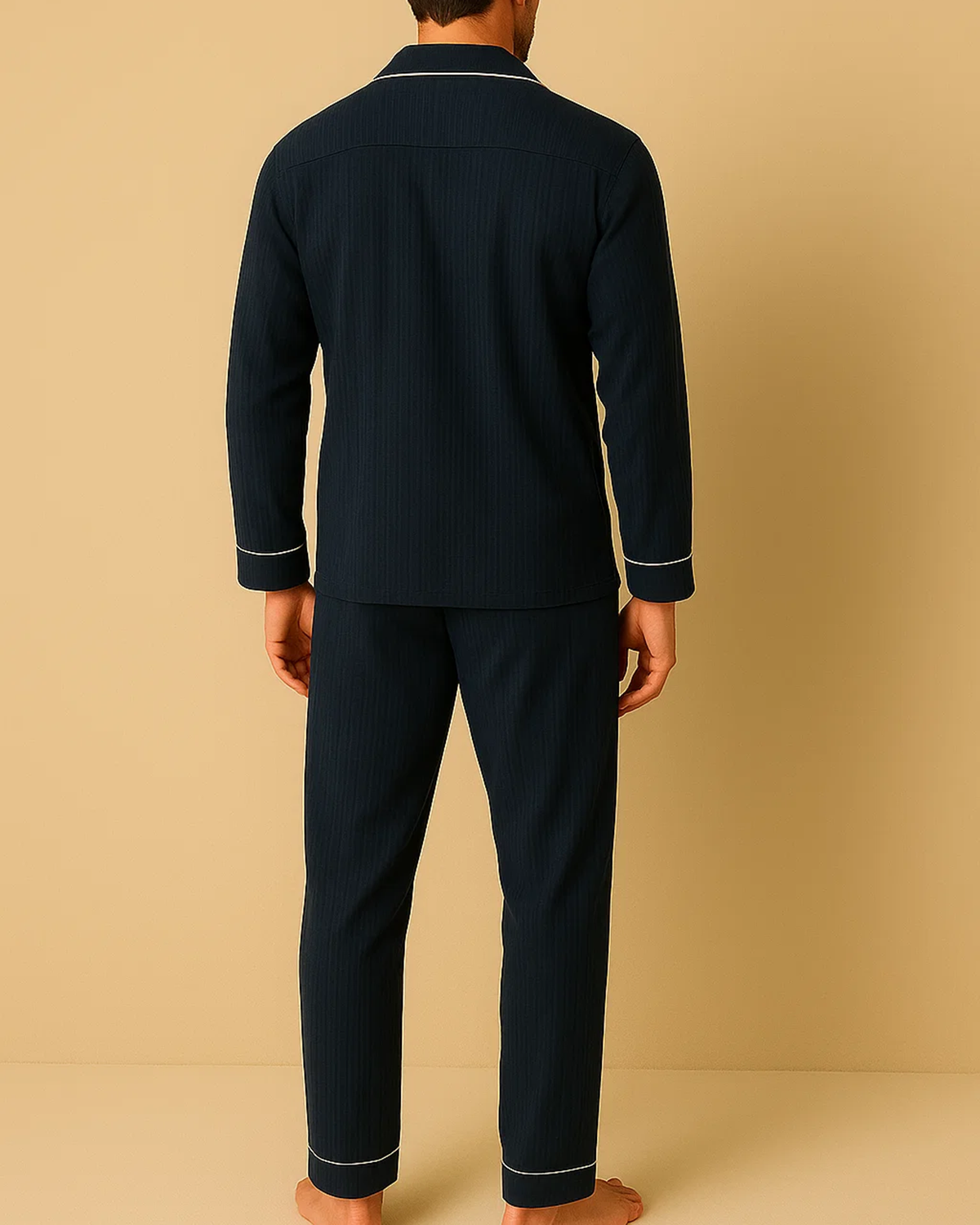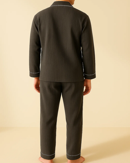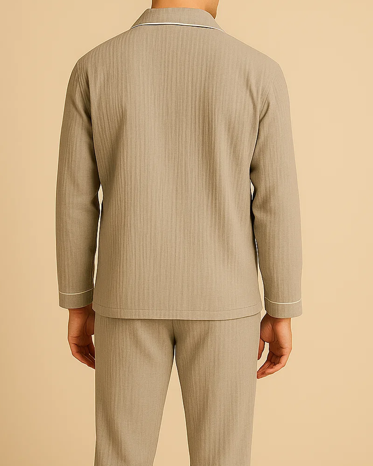 Designed with a long-sleeve, button-up shirt featuring refined piping, paired with matching full-length trousers, this set brings classic style to modern sustainable living. Thoughtfully made per order using ethical practices and natural materials, it's a staple for the conscious wardrobe.