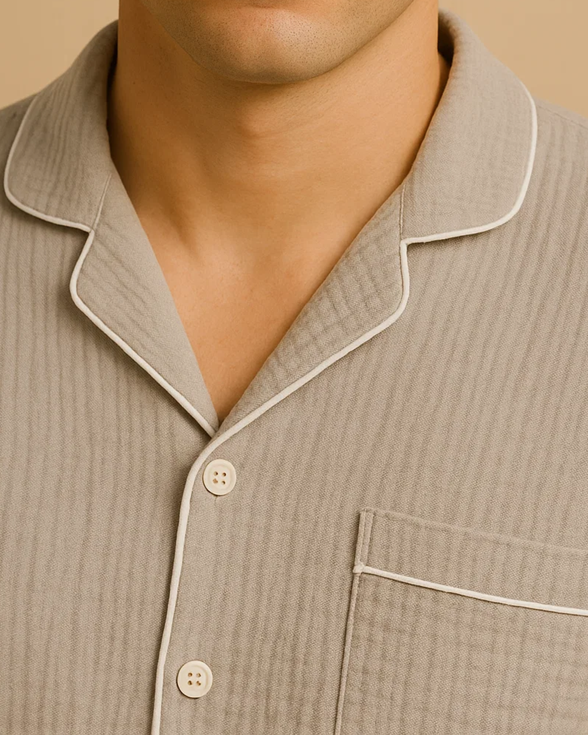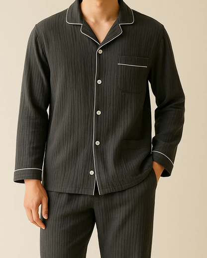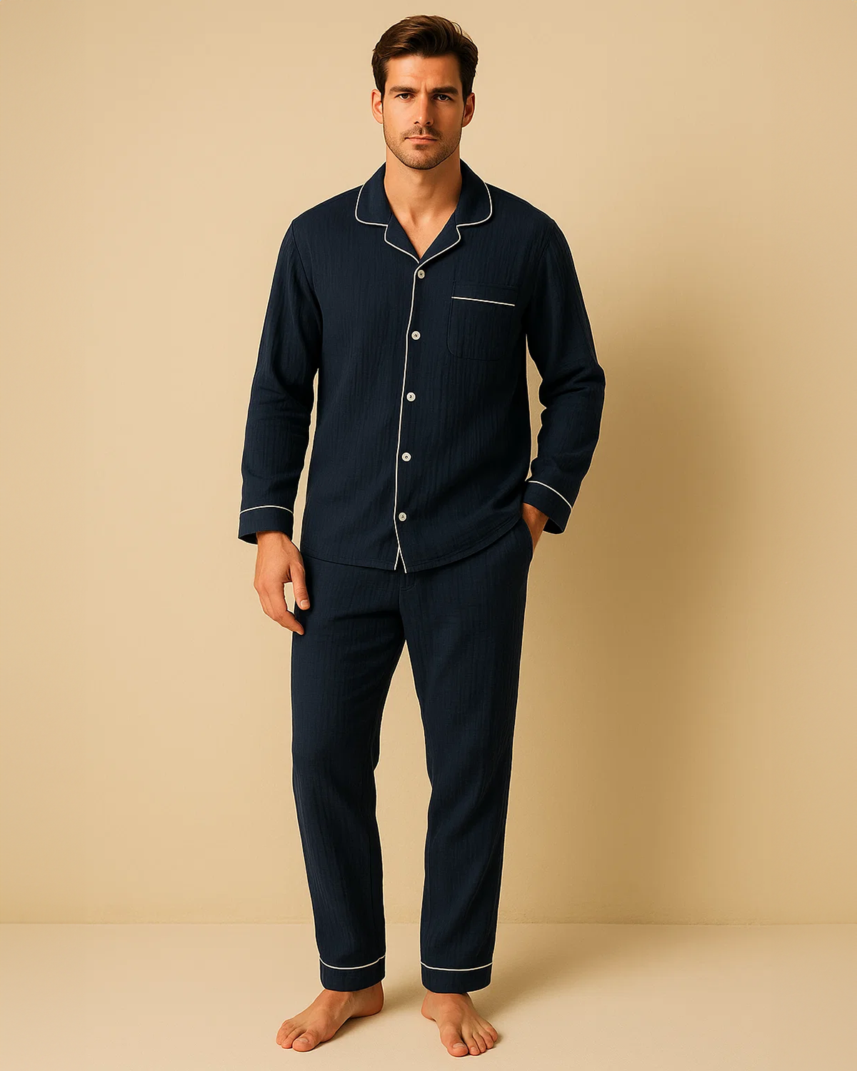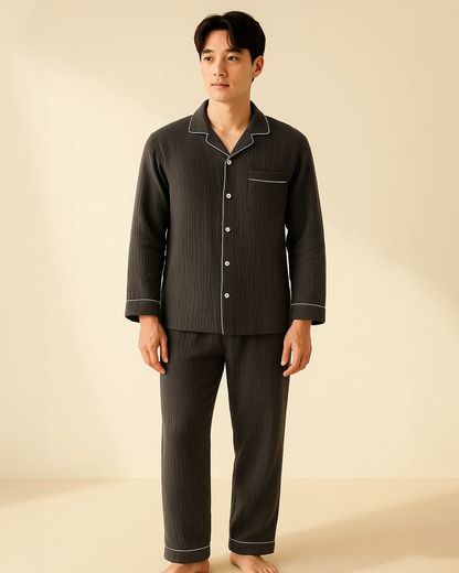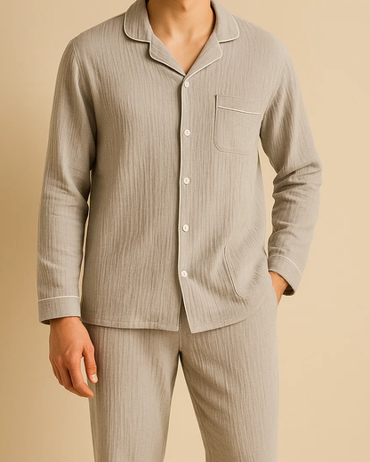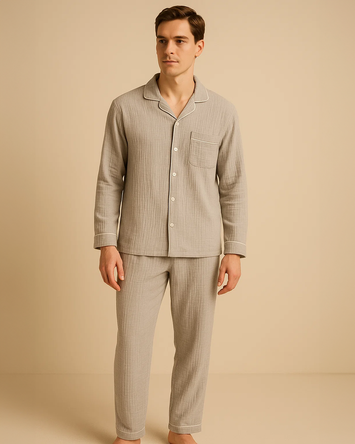 Men’s Cotton Muslin Long Pyjama Set – Lightweight Crepe Button-Up