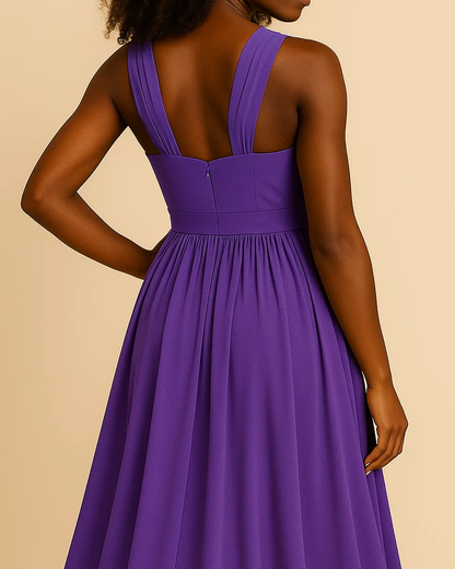 Drape yourself in timeless sophistication with the Arabella Dress—a regal, floor-length gown created for the conscious modern woman. Designed in a striking purple hue, this dress features a gathered cross-front bodice, flattering waistline, and a gracefully flowing skirt made from sustainable, vegan-certified materials.