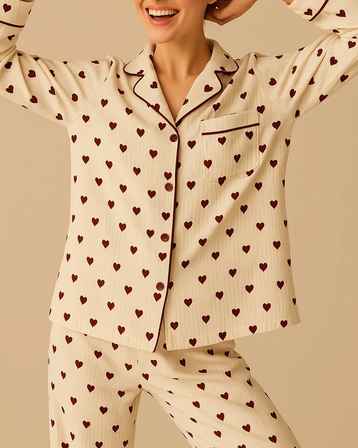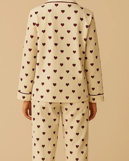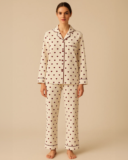 The set features a timeless button-down shirt with a notched collar and chest pocket, finished with deep red heart motifs that bring a romantic charm. Coordinating straight-leg trousers offer relaxed comfort and subtle elegance with matching piped cuffs.